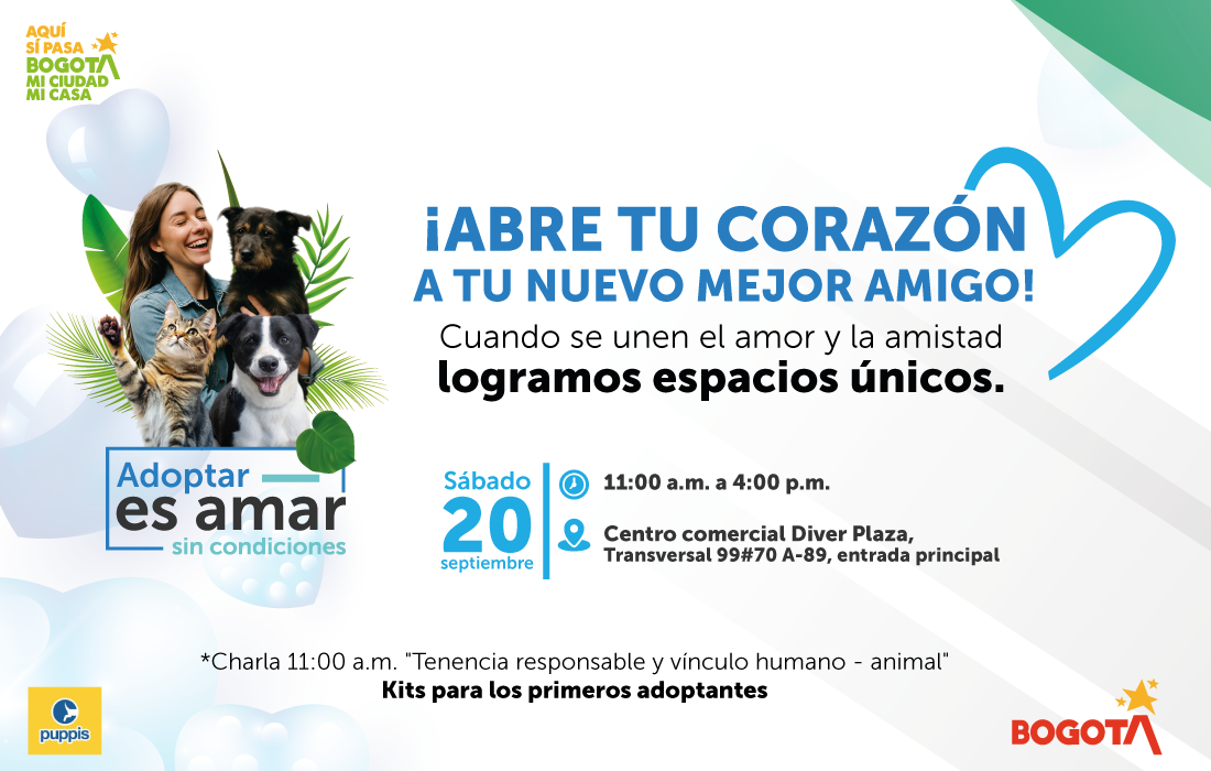 Bogotá D.C., 18 de septiembre de 2025 (@animalesbog). En el marco de la celebración del Día del Amor y la Amistad, la Alcaldía de Bogotá invita a la ciudadanía a unirse a la campaña “Adoptar es amar sin condiciones” participando en la jornada especial de adopción que se llevará a cabo este sábado 20 de septiembre, de 11:00 a.m. a 4:00 p.m., en el Centro Comercial Diver Plaza, en la Transversal 99 # 70 A – 89.